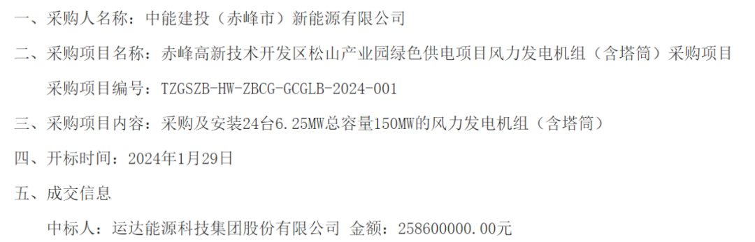 3月4日,赤峰高新技术开发区松山产业园绿色供电项目风力发电机组(含塔筒)采购项目中标公示,运达股份中标,中标价2.586亿元。