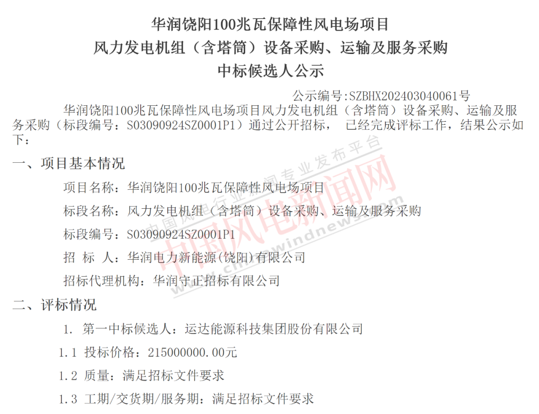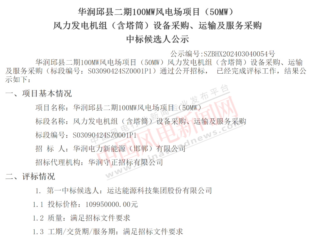 3月4日,华润电力连续发布华润阜城50兆瓦市场化风电场项目、华润饶阳100兆瓦保障性风电场项目、华润邱县二期100MW风电场项目(50MW)三个风电项目风力发电机组(含塔筒)设备采购、运输及服务采购中标候选人公示,规模共计200MW,运达股份预中标,投标总价4.349亿元。