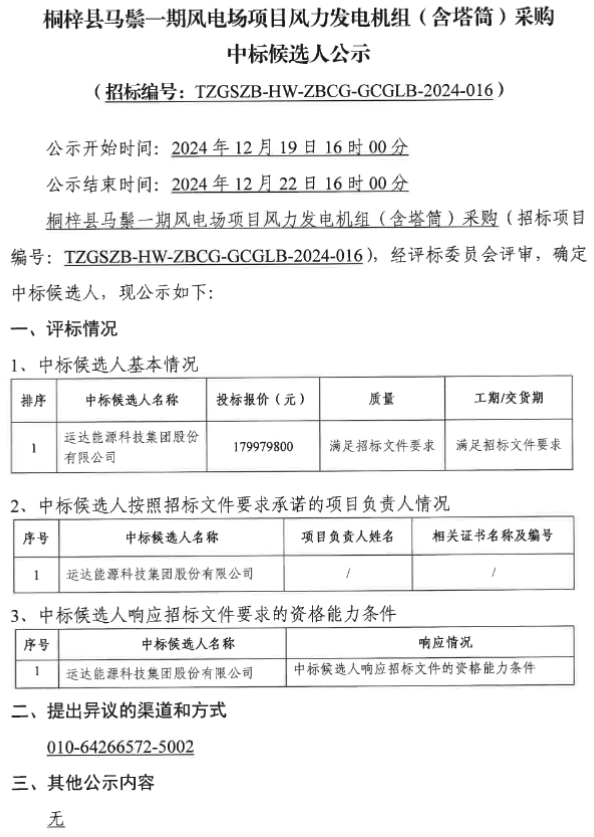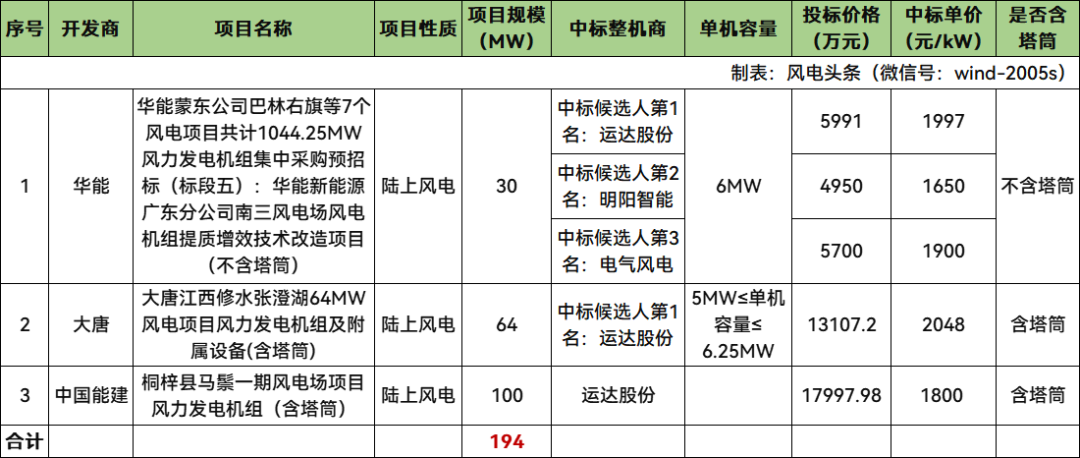 根据招标公告,华能新能源广东分公司南三风电场风电机组提质增效技术改造项目:单机容量6MW;风机数量5台;叶轮直径≥172米;轮毂高度:≥105米且所有风机轮毂高度一致,叶片运行的最低点距离地面不低于15米。风电机组安全等级至少需满足IEC I C类及以上要求,且应满足50年一遇极端风速70米/s(3秒平均)和50年一遇最大风速(10分钟平均) 50m/s的要求。本项目不接受不同机型的混排方案,不接受容量调整,接受6.X MW等级机型降容替代。本项目采用钢塔。