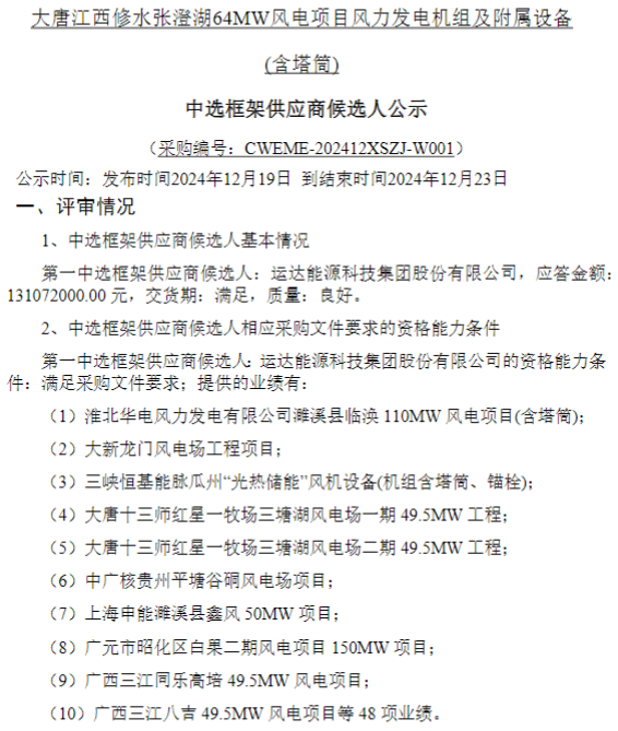 江西修水张澄湖64MW风电项目采购容量64MW,5MW≤单机容量≤6.25MW,191m≤叶轮直径≤205m;115m≤轮毂高度≤120m;不接受混排;接受降容,允许降容后的容量为4MW及以上;限定钢塔。交货日期:2025.05-2025.11。