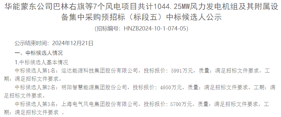 近日,华能蒙东公司巴林右旗等7个风电项目共计1044.25MW风力发电机组及其附属设备集中采购预招标(标段五)、大唐江西修水张澄湖64MW风电项目(含塔筒)、桐梓县马鬃一期风电场项目风力发电机组(含塔筒)中标候选人公示。项目总规模194MW,单机容量5MW-6MW。