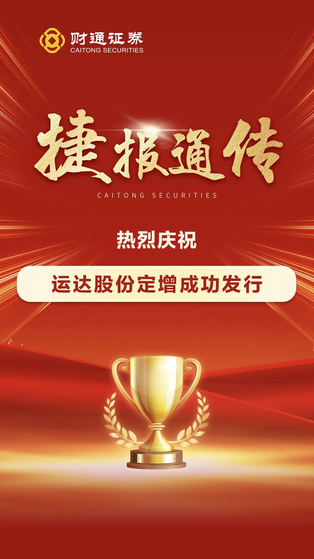 近日,由财通证券担任保荐机构的运达能源科技集团股份有限公司(简称“运达股份”)向特定对象发行股票项目成功发行,募集资金7亿元,财通证券投行股权业务喜迎开门红!