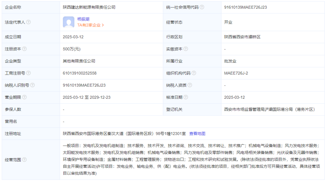 查询显示,近日,陕西建达新能源有限责任公司成立,法定代表人为杨振潮,注册资本500万元,经营范围包含:发电机及发电机组制造;太阳能发电技术服务;发电机及发电机组销售;机械电气设备销售等。股权穿透显示,该公司由运达股份、陕西建工集团等共同持股。