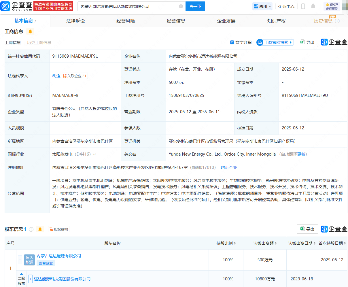 近日,内蒙古鄂尔多斯市运达新能源有限公司成立,法定代表人为胡适,注册资本为500万元,经营范围包含:发电机及发电机组制造;太阳能发电技术服务;风力发电技术服务;发电技术服务;电池制造;电池零配件生产;电池销售;电池零配件销售等。股权穿透显示,该公司由运达股份(300772)间接全资持股。