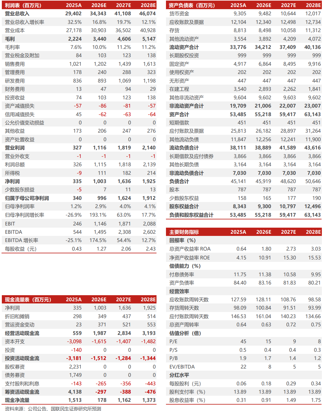 盈利水平方面,2025年公司销售毛利率为7.56%、同比下降1.44pcts,净利率为1.14%、同比下降0.97pcts。