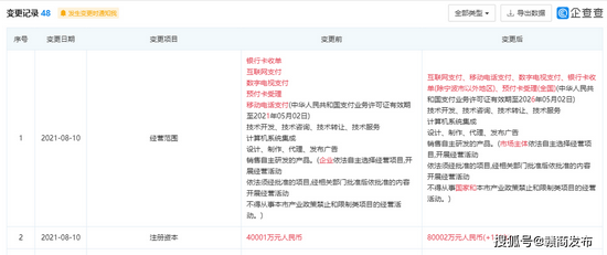 首家独立上市的第三方支付公司拉卡拉支付股份有限公司(下称“拉卡拉”)近来动态不断。工商信息显示,近日,拉卡拉发生工商变更,支付牌照续展至2026年5月,同时注册资本金由约4亿元增至约8亿元,增幅达100%。