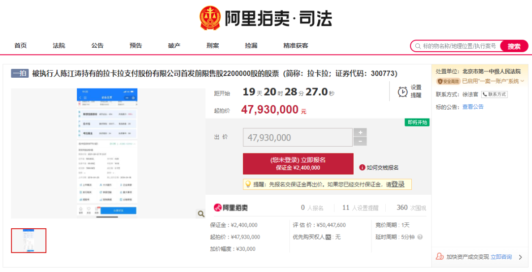 日前,阿里拍卖网站显示有220万股拉卡拉股票将在10月28日在淘宝网络司法拍卖平台上进行公开拍卖活动,占拉卡拉公司总股本的0.27%。