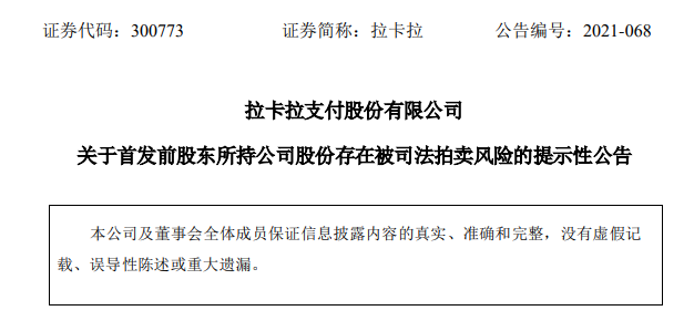 最后拉卡拉公告称司法拍卖事项尚处于公示阶段,后续需经过竞拍、缴款、法院裁定、股