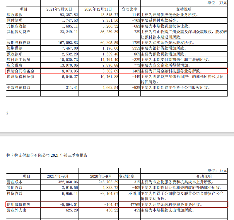 或是因支付业务利润空间压降,科技服务业务被拉卡拉寄予厚望。据介绍,拉卡拉的科技服务内容主要通过软件服务实现,如提供SaaS服务、系统解决方案及金融科技服务输出。三季报中未披露科技服务收入情况。不过,记者注意到,财报显示,在科技方面多项费用支出增长幅度较大。例如,保险合同准备金从去年底的3362.09万元增长至今年三季度末的8073.95万元,增幅为140%。信用价值损失从去年底的-104.47万元增长至今年三季度末的-5094.01万元,增幅高达4776%。财报解释称,上述两项业绩指标变动的原因均是“主要为开展金融科技服务业务所致。”
