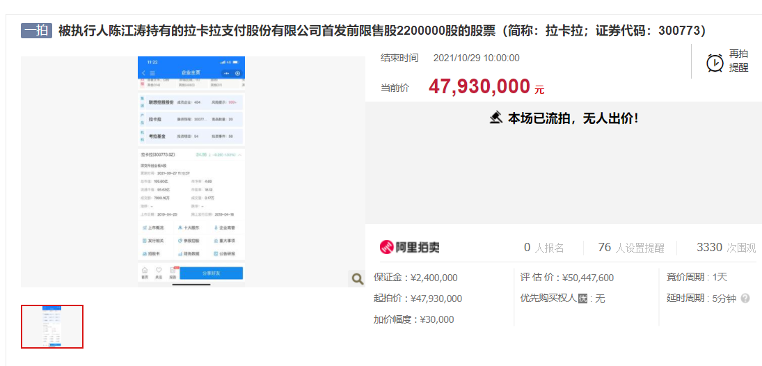 记者从阿里司法拍卖网站获悉,近日拉卡拉支付股份有限公司(下称“拉卡拉”)220万股股份在该平台上进行公开拍卖活动,占拉卡拉公司总股本的0.27%,结束时间为10月29日上午10时。截至拍卖结束,该标的因无人出价最终流拍。