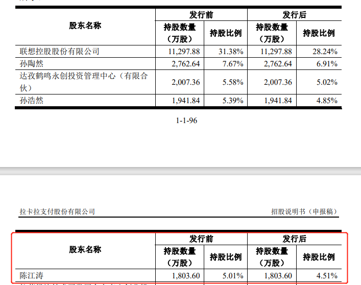 股份持有人陈江涛在业界也属于知名人士。在《2017胡润IT企业家榜》上,陈江涛曾以74亿元的身家排在榜单第32位。拉卡拉招股书显示,陈江涛在2014年8月曾以11.50元/股的价格对拉卡拉增资。2015年拉卡拉变更为股份公司,陈江涛以“净资产折股”的方式出资1803.6万元,占公司注册资本的比例为5.01%。在拉卡拉上市后,陈江涛的持股比例降至4.51%。2020年6月,拉卡拉实施了“10转10股派20元(含税)”的分红方案,陈江涛获得了3000多万元现金红利,其在拉卡拉的投资收获了丰厚的回报。