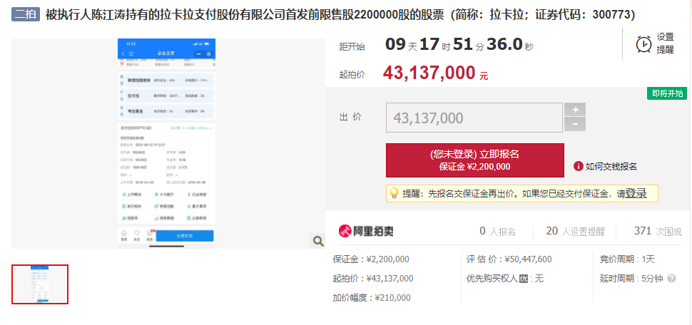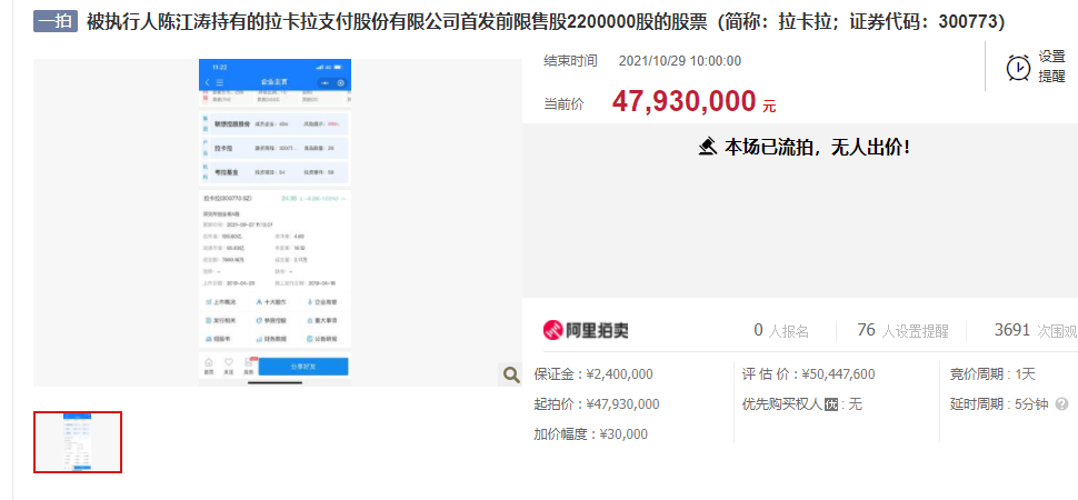 公告显示拉卡拉支付于2021年9月27日披露了《关于首发前股东所持公司股份存在被司法拍卖风险的提示性公告》(公告编号:2021-068)。公司首发前股东陈江涛先生所持有的公司2,200,000股股份(占公司股份总数的0.27%),于2021年10月28日10时起至2021年10月29日10时止在拍卖网络平台上进行第一次公开拍卖。根据拍卖网络平台页面显示的拍卖结果,第一次拍卖流拍。