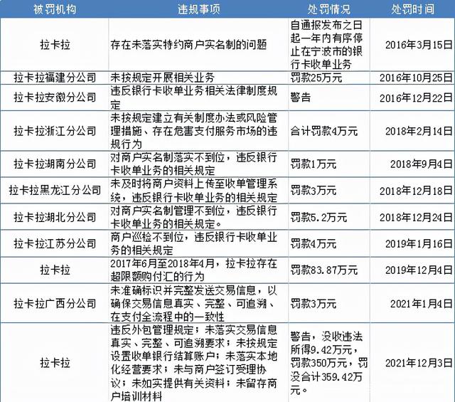2018年12月,拉卡拉支付股份有限公司湖北分公司因违反银行卡收单业务管理规定,被处罚款5.2万元。同月,拉卡拉支付股份有限公司黑龙江分公司被人民银行哈尔滨中心支行处以3万元罚款。