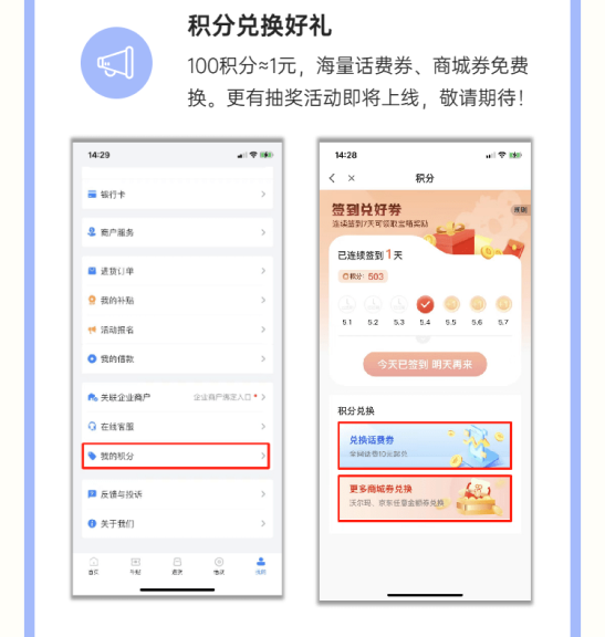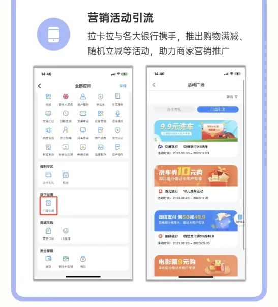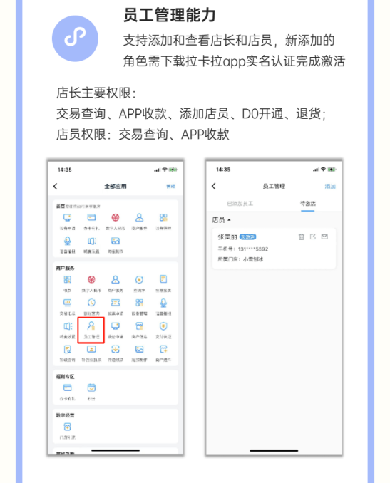 新增的积分兑换、员工管理、营销活动等功能,