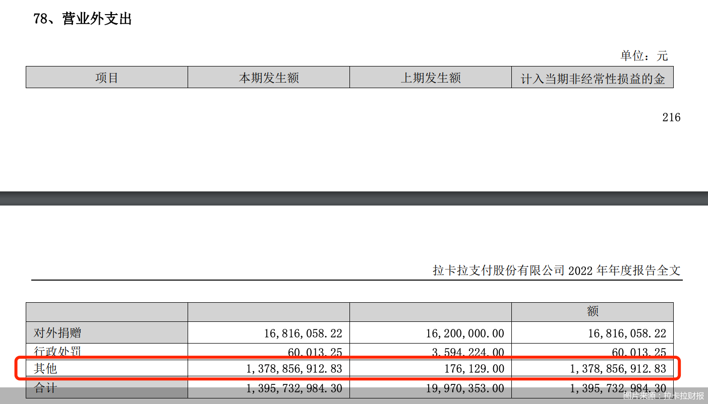2022年中,第三方支付机构因“跳码”遭处罚的消息传言四起。2023年4月18日,拉卡拉一纸重大事项的提示性公告承认“跳码”,并提出将退还涉及资金。在2022年财报中,受到“待处理资金影响”,拉卡拉营业外支出共计13.96亿元,其中包括“其他”13.78亿元,这也意味着拉卡拉因为“跳码”需退还的金额为13.78亿元。