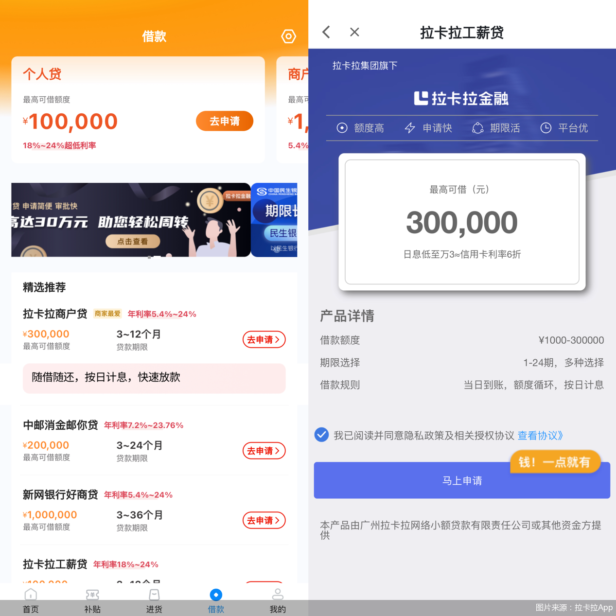在面向个人用户的“拉卡拉工薪贷”产品页面,用户最高可借额度提升至30万元,同时页面提示该产品由广州拉卡拉小贷或其他资金方提供。在对应授权协议中,拉卡拉提出该借款仅限于个体工商户的日常经营或日常消费贷款。
