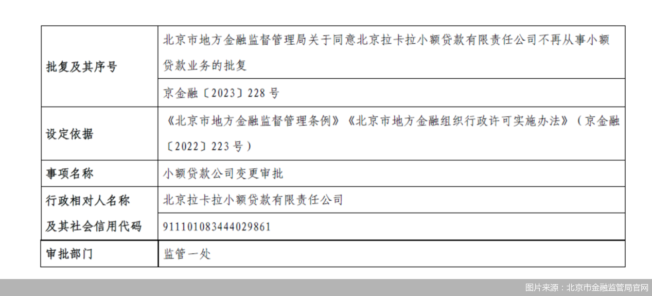 6月5日,北京商报记者注意到,北京市地方金融监督管理局(以下简称“北京市金融监管局”)日前发布小额贷款公司变更审批事项公告,同意北京拉卡拉小额贷款有限责任公司(以下简称“北京拉卡拉小贷”)不再从事小额贷款业务。更早一点,拉卡拉退出中邮消费金融的股东行列,另一张网络小贷牌照注册资本也降至2亿元。