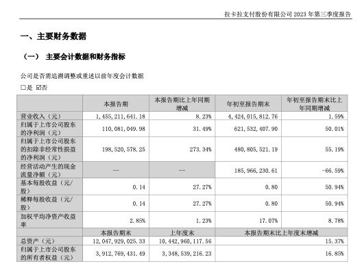 10月20日,拉卡拉支付股份有限公司(以下简称“拉卡拉”或“公司”)发布2023年第三季度报告。报告期内,公司数字支付业务收入增长以及毛利率提升,主营业务盈利能力进一步提高,前三季度实现归属母公司股东净利润6.22亿元,同比增长50%;扣非后归属母公司股东净利润4.81亿元,同比增长55%,其中,三季度扣非后归属母公司股东净利润1.99亿元,同比增长273%,环比增长107%。