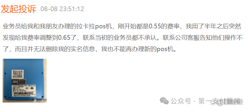 据用户投诉,其办理的拉卡拉pos机,最初约定是0.55%的费率,用了半年之后却发现费率变成0.65%了,联系当初的业务员不承认,公司客服告知他操作不了,而且无法删除个人实名信息,导致其也不能再办理新的pos机。