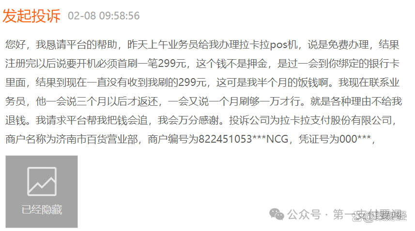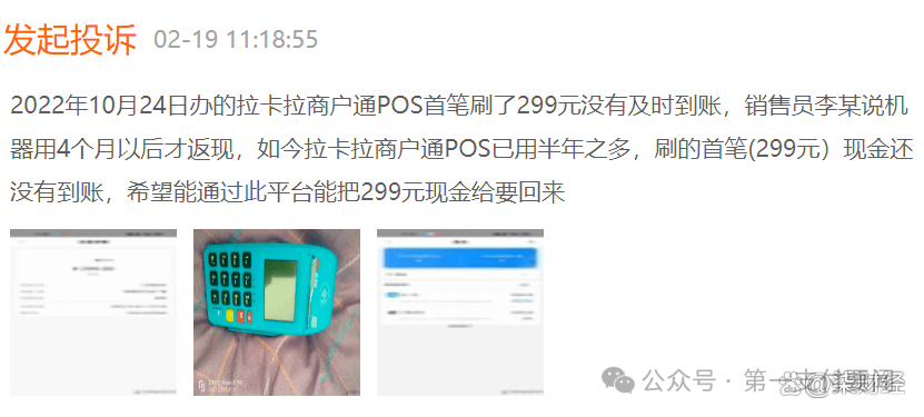无独有偶,另一位商户于今年2月投诉称,2022年10月24日办的拉卡拉商户通POS,首笔刷了299元没有及时到账,销售员李某说机器使用4个月以后才给返现,如今已经过去近半年之久,刷的首笔(299元)现金还没有到账。