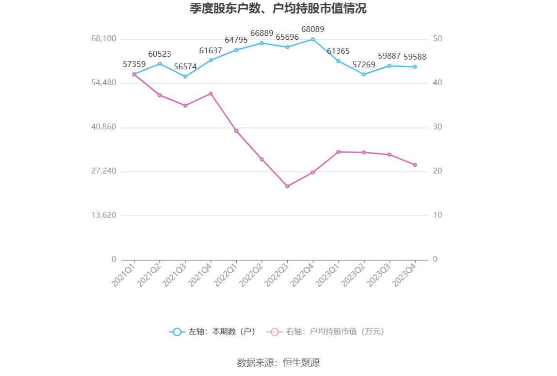筹码集中度方面,截至2023年年末,公司股东总户数为5.96万户,较三季度末下降了299户,降幅0.50%;户均持股市值由三季度末的23.87万元下降至21.54万元,降幅为9.76%。