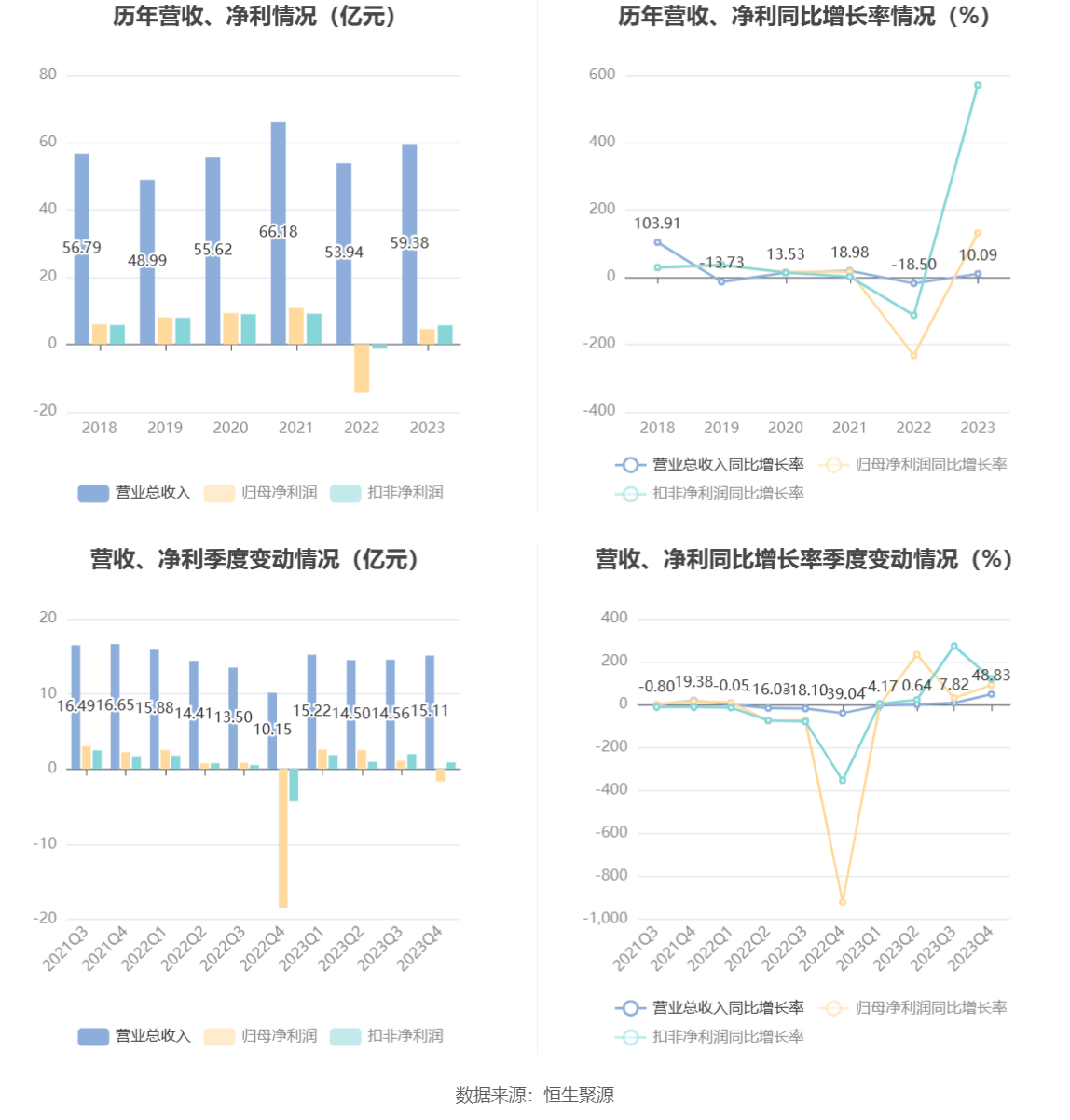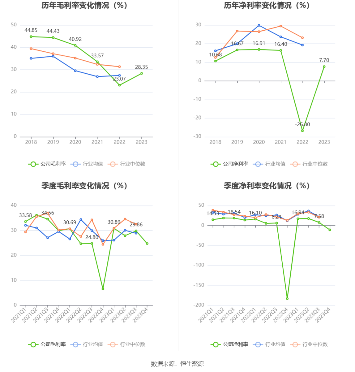 2023年,公司毛利率为28.35%,同比上升5.28个百分点;净利率为7.70%,较上年同期上升34.50个百分点。从单季度指标来看,2023年第四季度公司毛利率为24.77%,同比上升18.21个百分点,环比下降5.09个百分点;净利率为-10.86%,较上年同期上升172.26个百分点,较上一季度下降18.44个百分点。