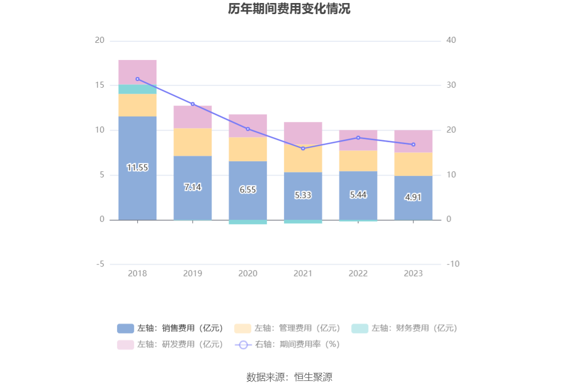 2023年,公司期间费用为9.99亿元,同比增长1383.11万元;但期间费用率为16.83%,同比下降1.52个百分点。其中,销售费用同比下降9.73%,管理费用同比增长13.35%,研发费用同比增长9.1%,财务费用-307.15万元,去年同期-1827.26万元。