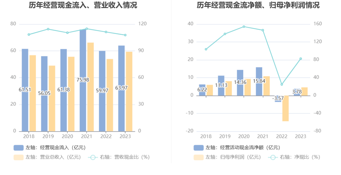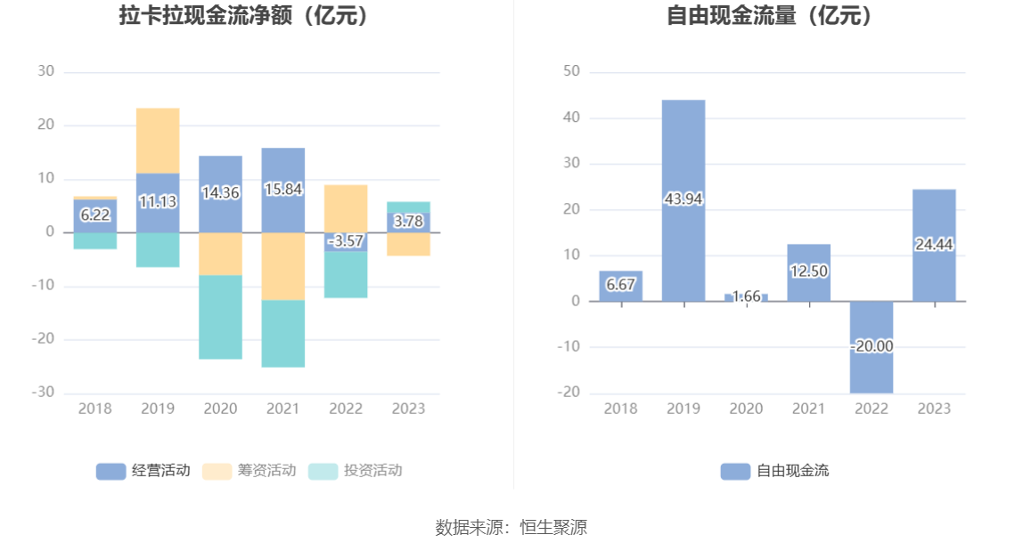 进一步统计发现,2023年公司自由现金流为24.44亿元,上年同期为-20.00亿元。