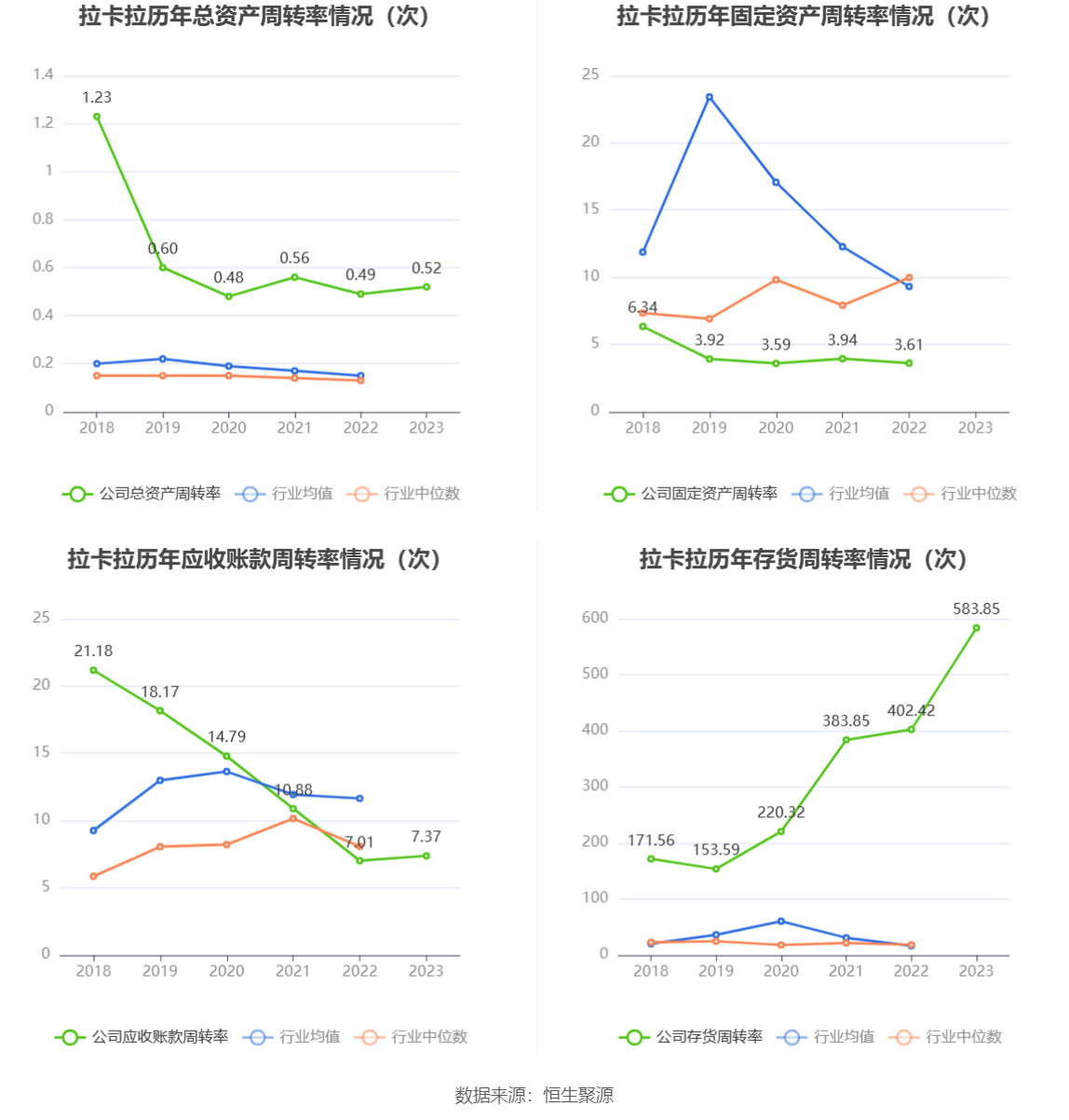 营运能力方面,2023年,公司公司总资产周转率为0.52次,上年同期为0.49次(2022年行业平均值为0.15次,公司位居同行业4/33);公司应收账款周转率、存货周转率分别为7.37次、583.85次。
