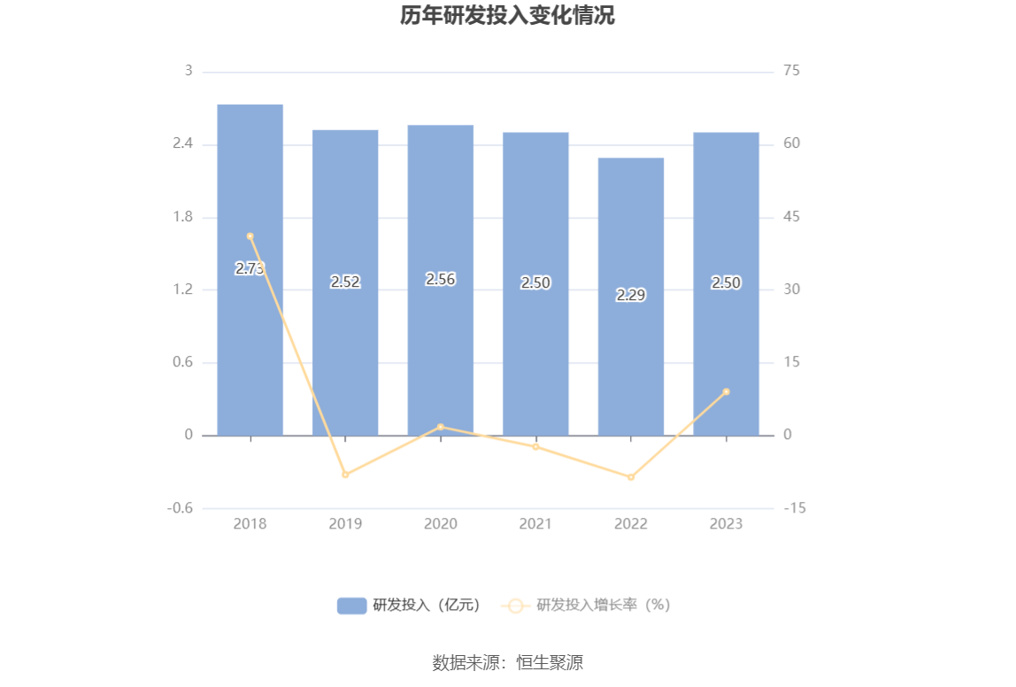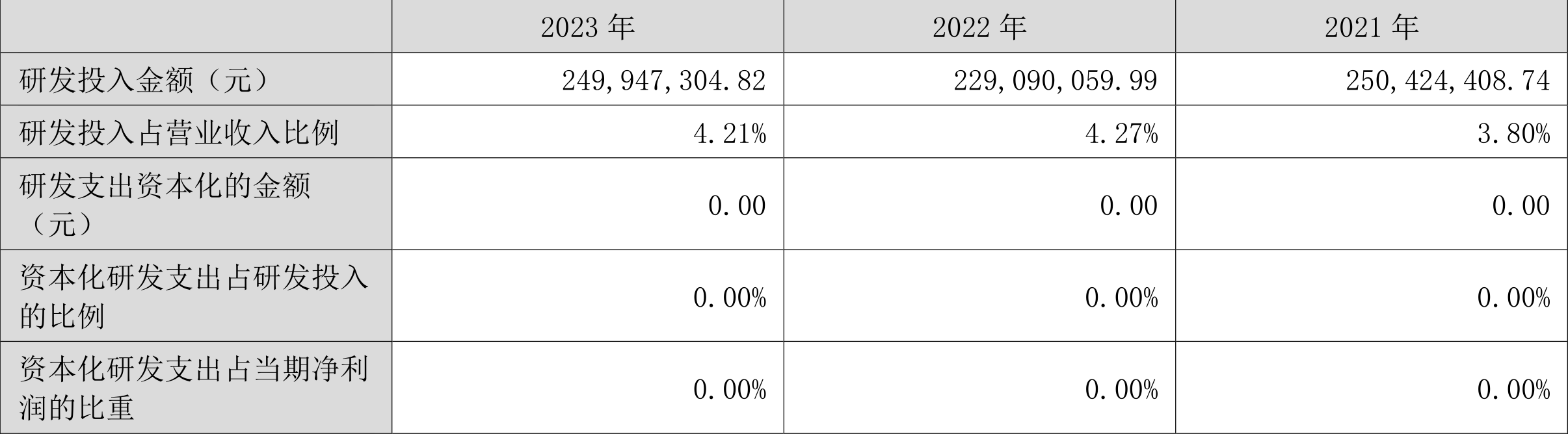 2023年全年,公司研发投入金额为2.50亿元,同比增长9.10%;研发投入占营业收入比例为4.21%,相比上年同期下降0.06个百分点。此外,公司全年研发投入资本化率为0。