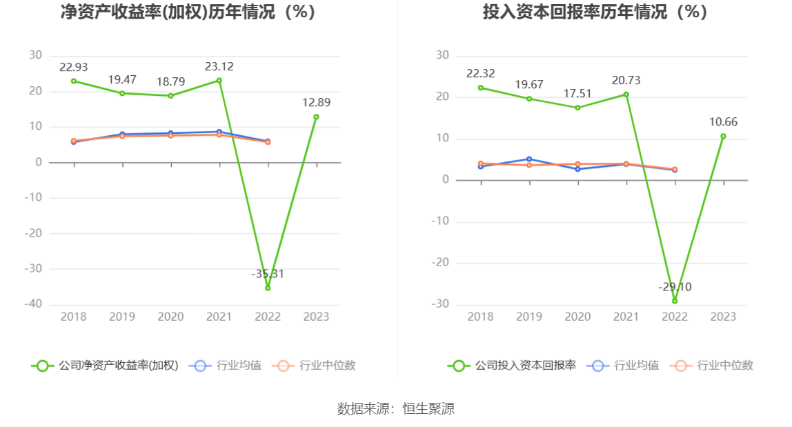 数据显示,2023年公司加权平均净资产收益率为12.89%,较上年同期增长48.20个百分点;公司2023年投入资本回报率为10.66%,较上年同期增长39.76个百分点。