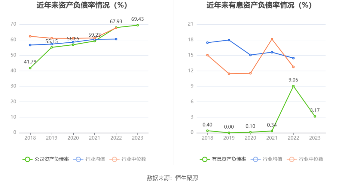 在偿债能力方面,公司2023年年末资产负债率为69.43%,相比上年末上升1.50个百分点;有息资产负债率为3.17%,相比上年末下降5.88个百分点。