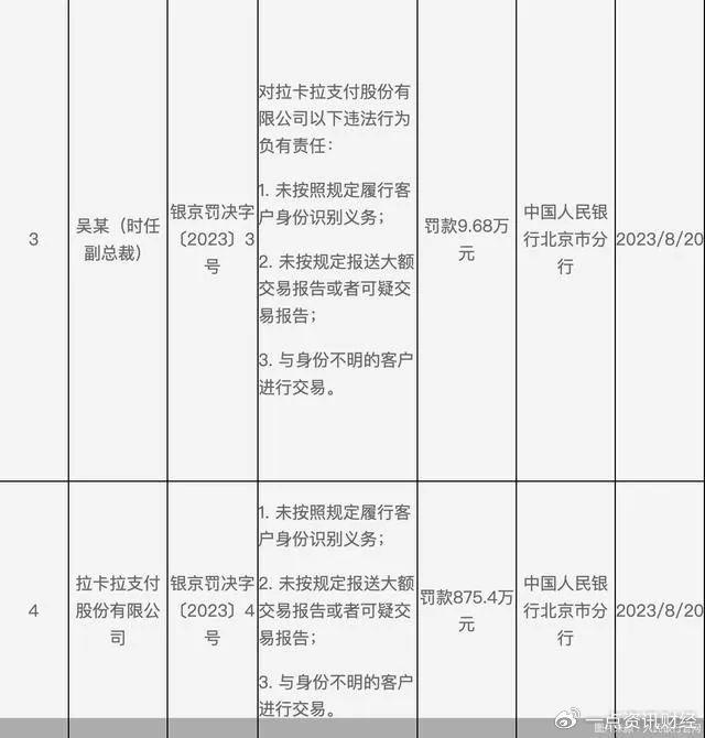 据北京商报2023年8月报道,人民银行北京市分行当时披露多张行政处罚信息表,其中拉卡拉支付股份有限公司领到“双罚”罚单。