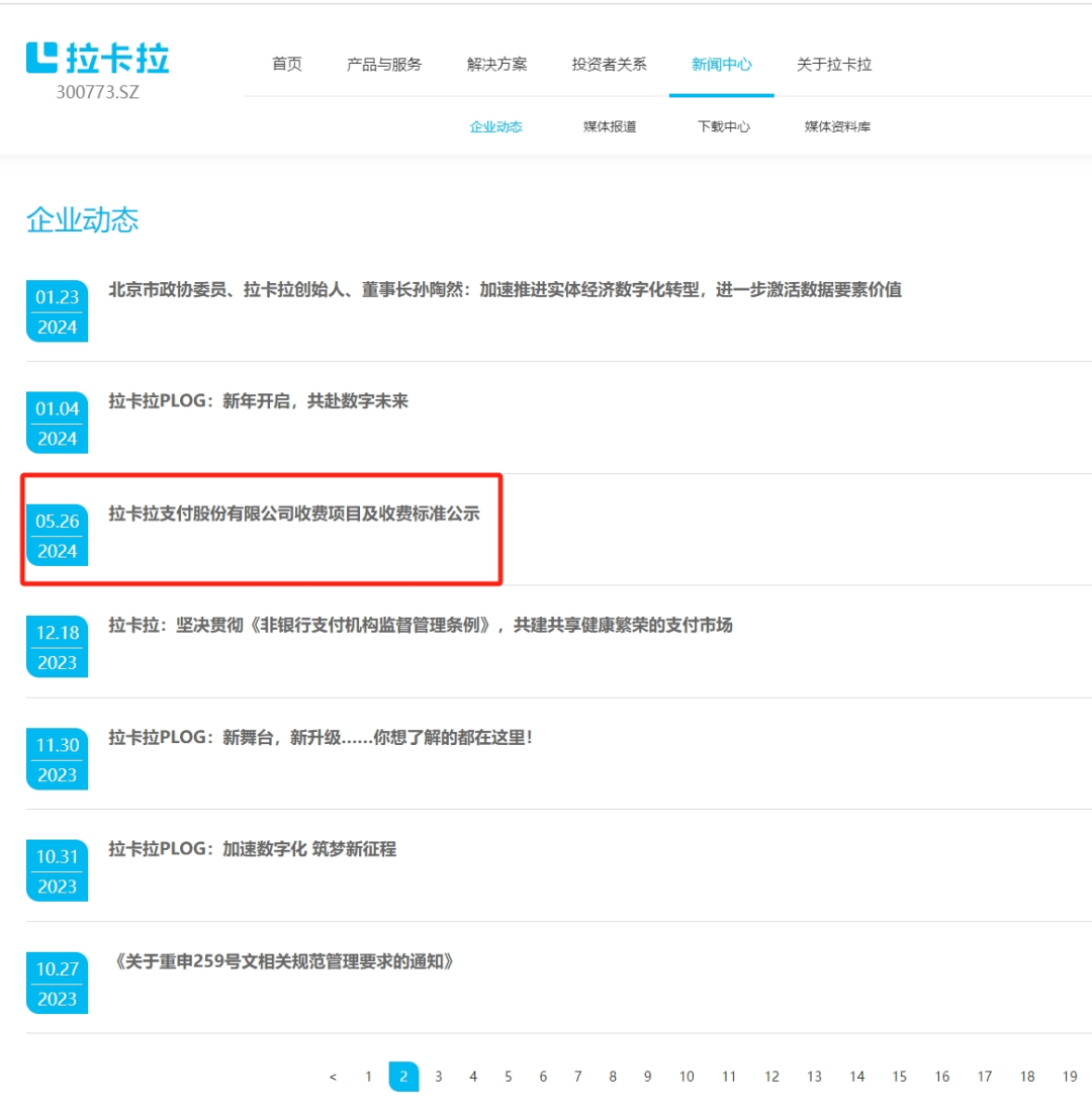 5月26日,拉卡拉应监管要求,在其官网发布《拉卡拉支付股份有限公司收费项目及收费标准公示》。