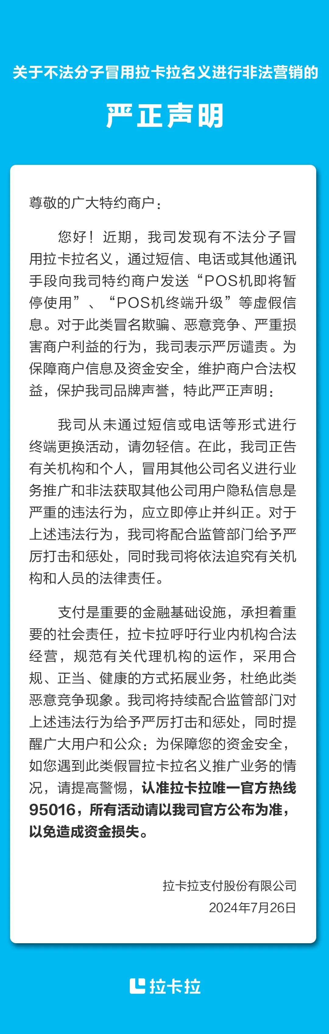关于不法分子冒用拉卡拉名义进行非法营销的严正声明