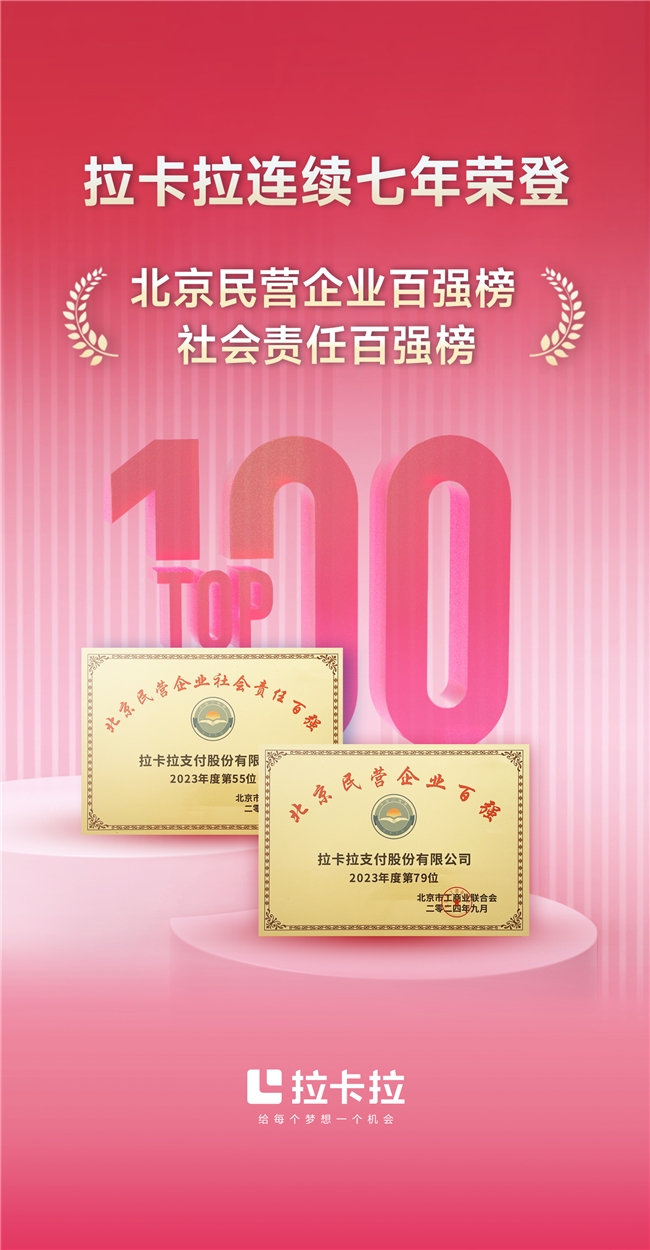 北京民营企业百强调研与发布工作已连续开展7年,旨在发掘一批符合首都城市功能定位,契合“高精尖”经济结构,具有引领示范带动效应的优质民营企业,推动民营经济高质量发展。自2018年以来,拉卡拉连续七年入选“北京民营企业百强榜”,得益于公司坚持以科技驱动创新,以创新驱动发展,在数字支付领域构筑起产品、服务和品牌的综合优势。