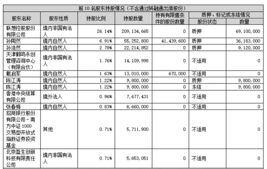 截至2024年9月30日,联想控股持股为26.14%,孙陶然持股为6.91%;孙浩然持股为2.78%,天津鹤鸣永创投资管理中心(有限合伙)持股为1.76%,戴启军持股为1.63%,陈江涛持股为1.22%;