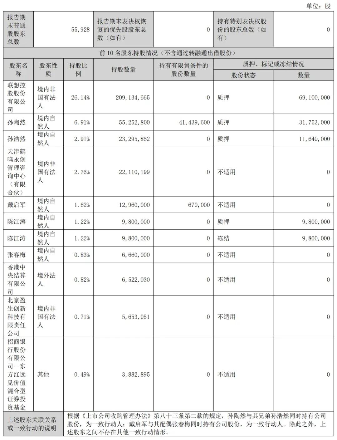 截至2024年6月30日,联想控股持股为26.14%,孙陶然持股为6.91%;孙浩然持股为2.91%,天津鹤鸣永创投资管理中心(有限合伙)持股为2.76%,戴启军持股为1.62%,陈江涛持股为1.22%;