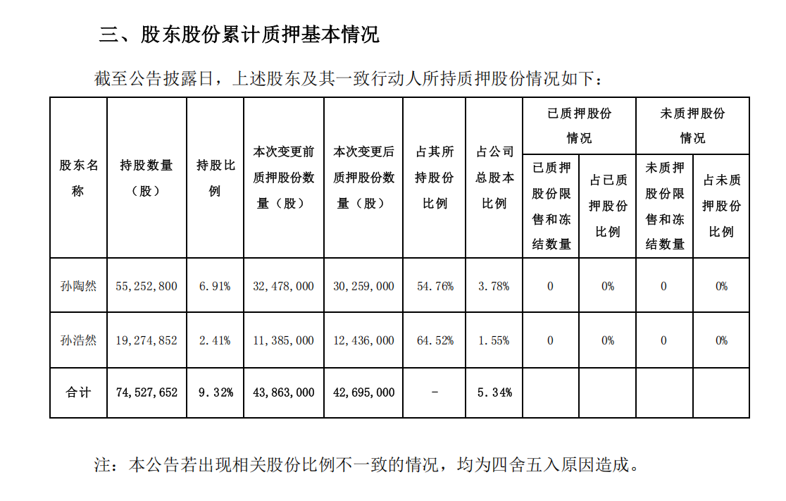 根据公告,11月25日,孙陶然质押148.6万股公司股份,占其所持有股份比例为2.69%,孙浩然质押105.1万股公司股份,占其所持股份比例的5.45%。