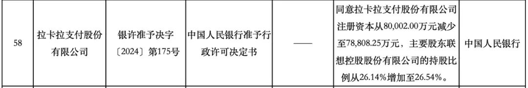 12月16日消息,日前,中国人民银行最新发布的非银行支付机构重大事项变更许可信息显示,拉卡拉支付股份有限公司(简称“拉卡拉”)已完成注册资本调整,从80002万元缩减至78808.25万元,与此同时,主要股东联想控股股份有限公司的持股比例从26.14%上升至26.54%。