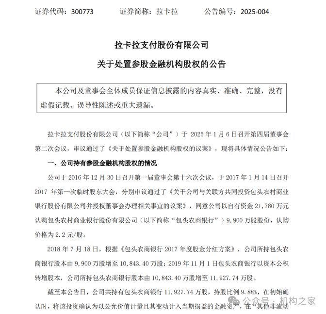 2015年1月6日,拉卡拉发布的一则“零元退股”公告引发了广泛关注。2025年1月6日,拉卡拉公司召开了第四届董事会第二次会议,审议并通过了《关于处置参股金融机构股权的议案》。基于公司整体发展战略、市场环境变化以及未来业务布局等多方面因素,为进一步聚焦主业发展,拉卡拉决定退出其持有的包头农村商业银行股份有限公司(以下简称“包头农商银行”)的全部股权。