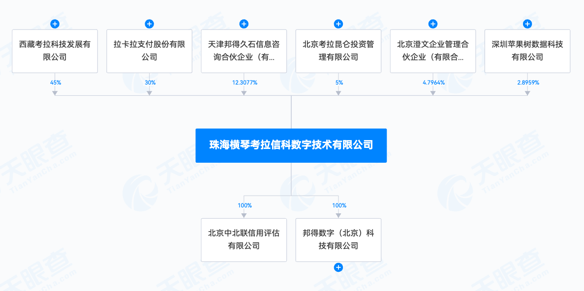 横琴考拉成立时间刚满两个月,由6家公司共同出资,且A股上市支付机构拉卡拉也在其股东之列。具体来看,横琴考拉的持股比例10%以上的股东有3个,分别是西藏考拉(持股45%)、拉卡拉(持股30%)、天津邦得久石信息咨询合伙企业(有限合伙)(以下简称“邦得久石”,持股12.3%)。