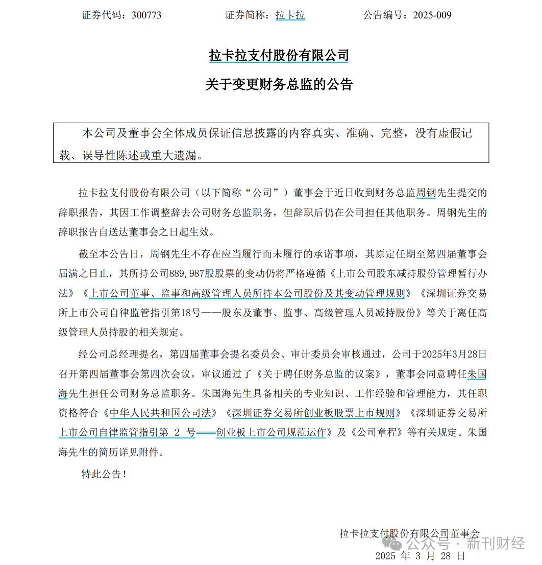 3月28日,拉卡拉支付股份有限公司(以下简称“拉卡拉”)发布重要人事变更公告,称近日收到财务总监周钢提交的辞职报告,其因工作调整辞去财务总监职务,辞职后仍在公司担任其他职务。与此同时,董事会同意聘任朱国海担任新任财务总监。