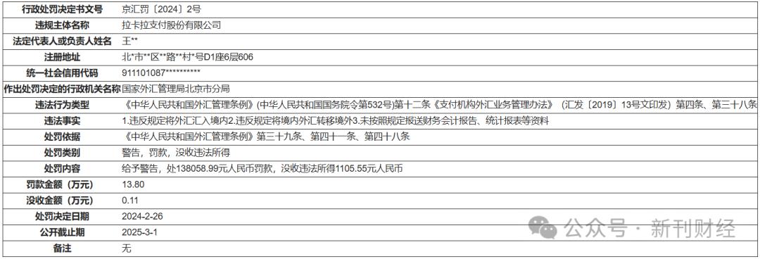 值得注意的是,周钢在担任财务总监期间,拉卡拉曾因多项违规行为遭遇监管处罚。例如,2024年2月,拉卡拉因违反规定将外汇汇入境内、未按规定报送财务报告等行为,被北京市外汇管理局罚款13.81万元,并没收违法所得1105.55元。此外,2019年12月,拉卡拉因在2017年6月至2018年4月期间超限额购付汇,也被国家外汇管理局处以83.87万元罚款。2023年,拉卡拉更因未按规定履行客户身份识别义务、未按要求报送大额交易报告或可疑交易报告等行为违反反洗钱法被罚款875.4万元。