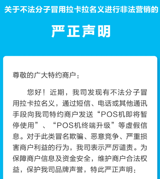 近日,拉卡拉、合利宝、易生支付等多家支付机构接连发布严正声明,提醒广大POS机用户警惕虚假信息以及个人信息泄露等问题。