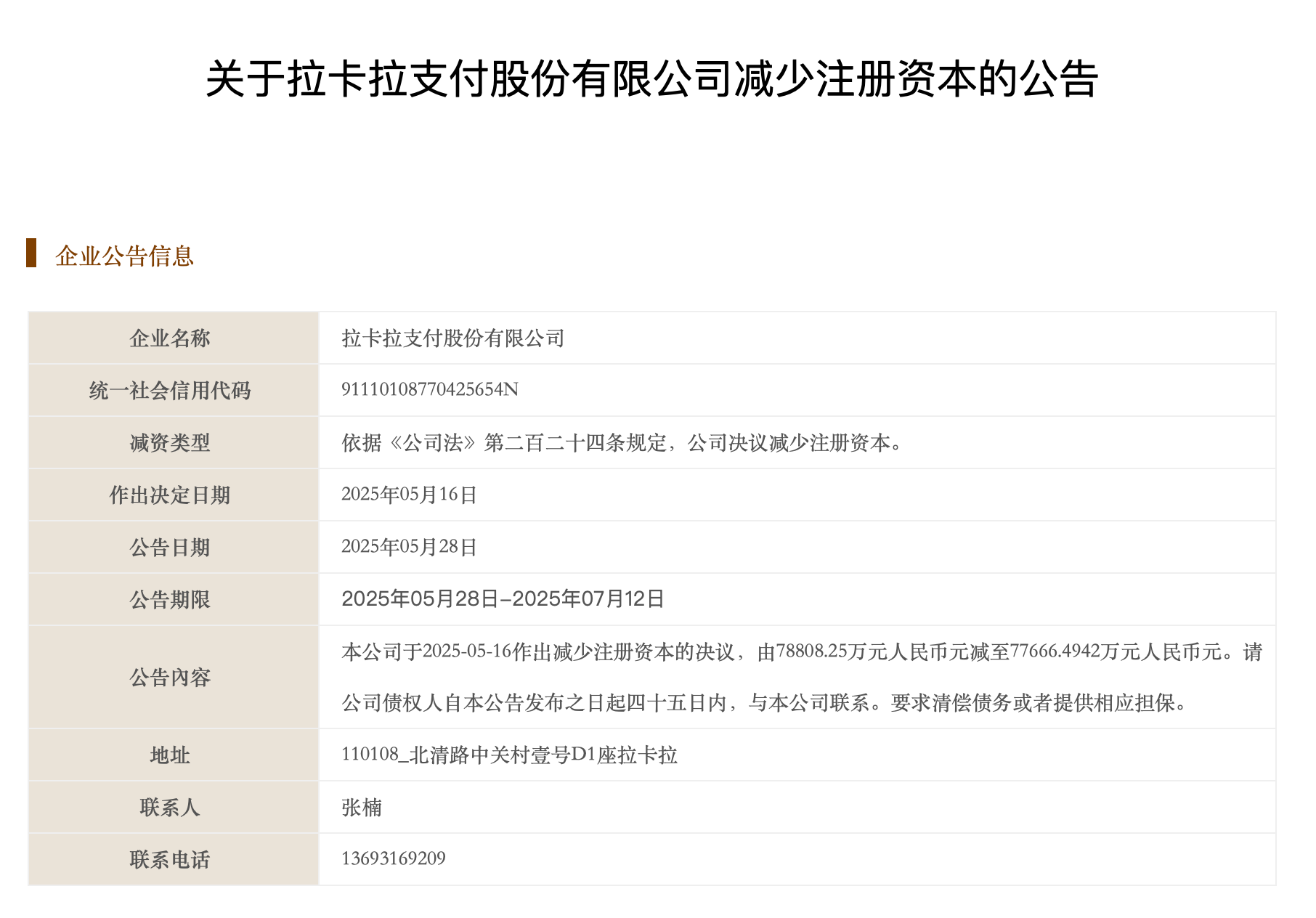 国家企业信用信息公示系统显示,拉卡拉于2025年5月16日作出减少注册资本的决议,由78808.25万元减至77666.49万元。同时,拉卡拉请公司债权人自本公告发布之日起四十五日内,与公司联系,要求清偿债务或者提供相应担保。公告期限为2025年5月28日至2025年7月12日。