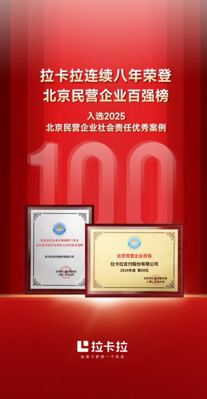 9月19日,北京市工商联发布2025北京民营企业“1+4”百强榜单,国内领先的数字支付服务商——拉卡拉支付股份有限公司(以下简称“拉卡拉”)再次凭借卓越的综合实力,成功入选“北京民营企业百强榜”。自2018年以来,拉卡拉已连续第八年获此殊荣。此外,拉卡拉还凭借在社会公益等领域的持续贡献同步入选“北京民营企业社会责任优秀案例”(共35家)。
