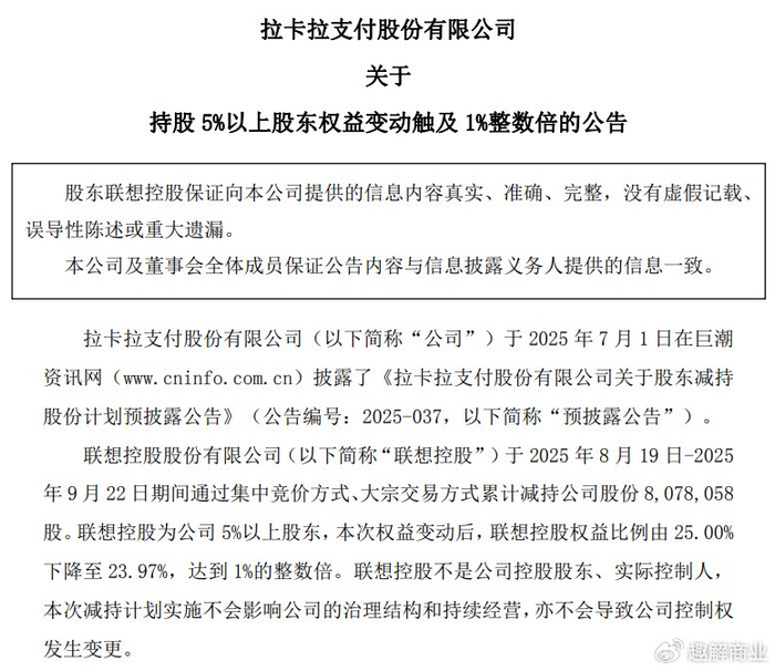 近日,拉卡拉发布公告,称股东联想控股于2025年8月19日-2025年9月22日期间通过集中竞价方式、大宗交易方式累计减持公司股份8,078,058股。联想控股为公司 5%以上股东,本次权益变动后,联想控股权益比例由 25.00%下降至 23.97%。