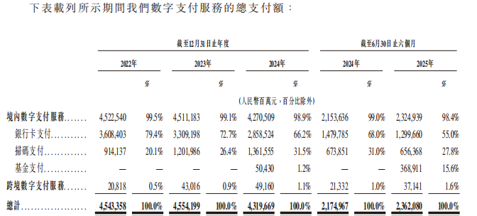 在细分业务中,跨境支付被寄予厚望。2024年交易额约491.6亿元,同比提升14.28%;2025年上半年达到371.41亿元。但与整体支付额相比占比仍不足2%,短期仍难成为公司新的支柱。
