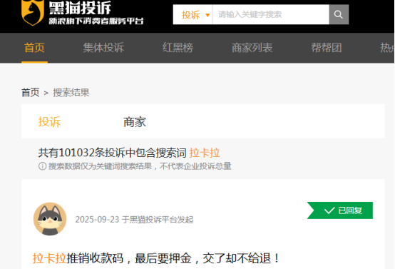 截至10月22日,在黑猫投诉平台上,以“拉卡拉”为关键词搜索,目前投诉量超10万条,涉及欺诈用户、乱收POS机开通费、不退押金等。